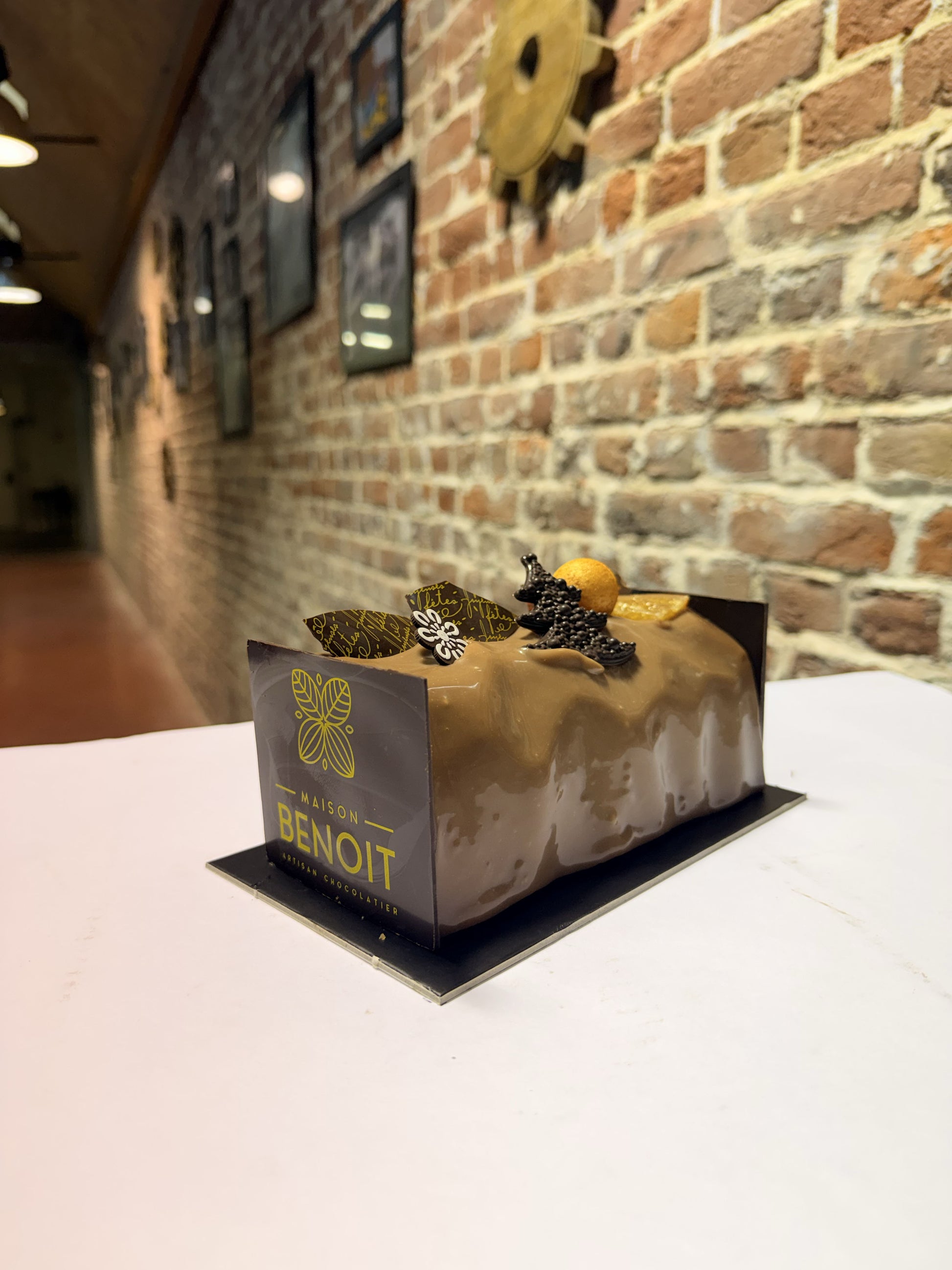 Biscuit moelleux amande, feuilleté praliné et croquant spéculos, biscuit viennois, compotée d'orange et ganache chocolat noir Équateur, mousse légère chocolat au lait